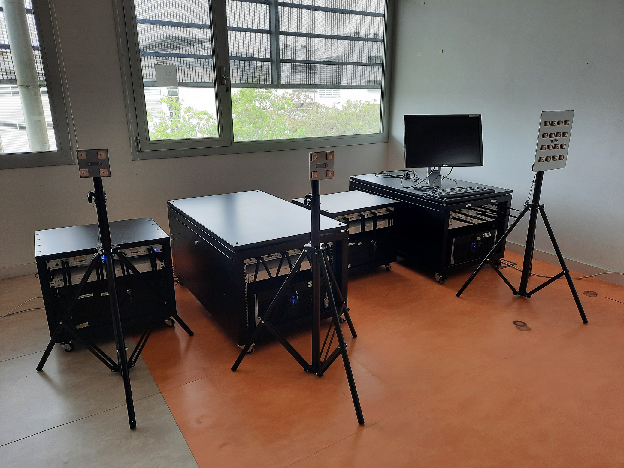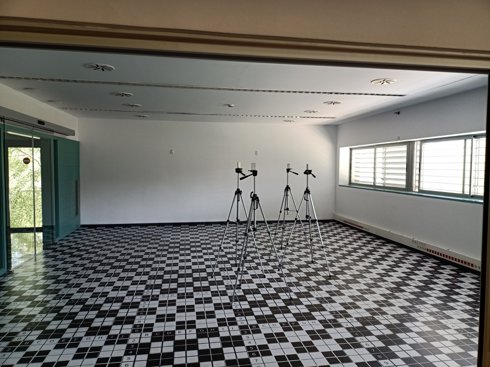 20-cm checkerboard vinyl flooring for visual location/positioning of equipment